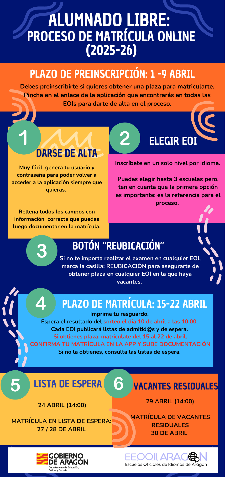 Una vez finalizado el proceso de admisión de alumnado, en aquellos idiomas, cursos y grupos en los que hayan quedado vacantes residuales (a partir del 7 de octubre y durante todo el primer trimestre), éstas se ofertarán también a antiguos alumnos y alumnas de Escuelas Oficiales de Idiomas para que puedan así actualizar su nivel de competencia en el idioma de que se trate. Se tendrán en cuenta las siguientes condiciones: